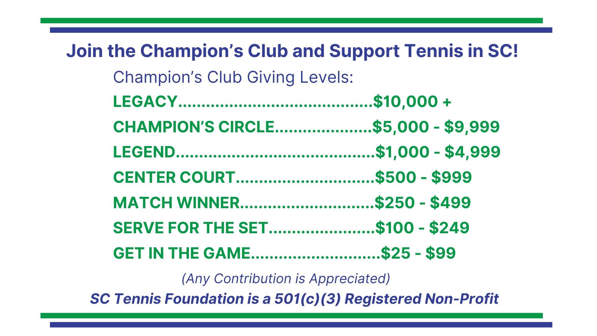 Your donation helps ensure that the future of tennis in South Carolina remains strong and inclusive. The SCTF is a 501(c)(3) registered non-profit.
